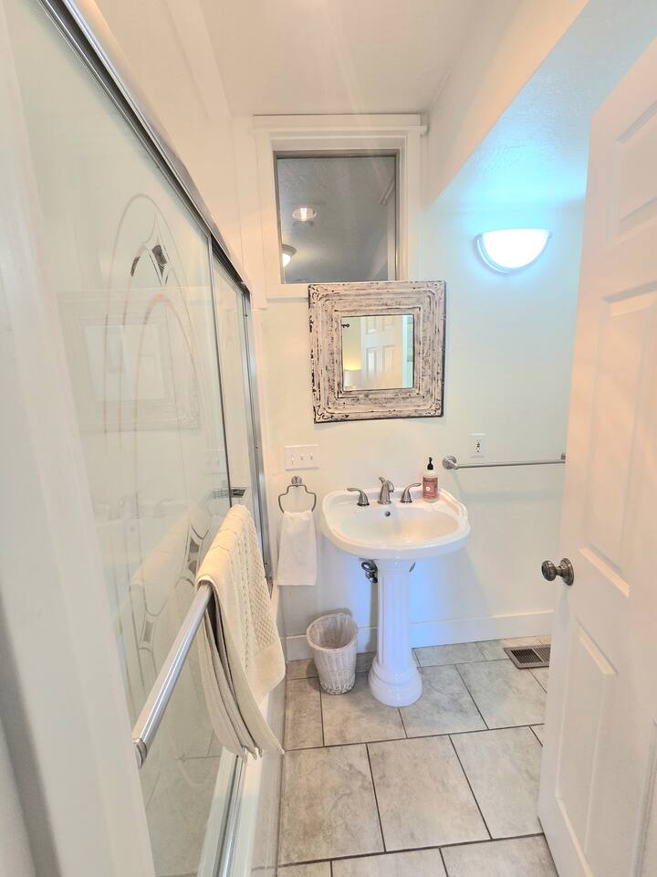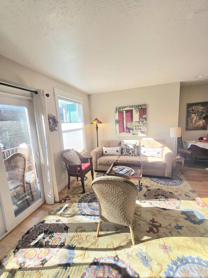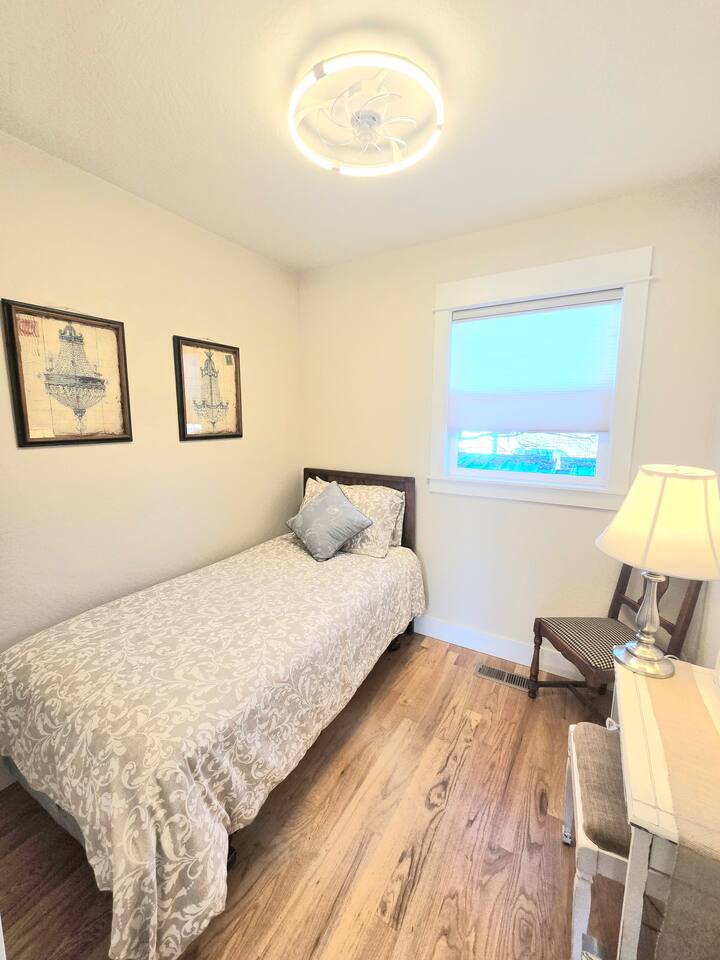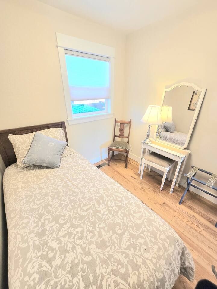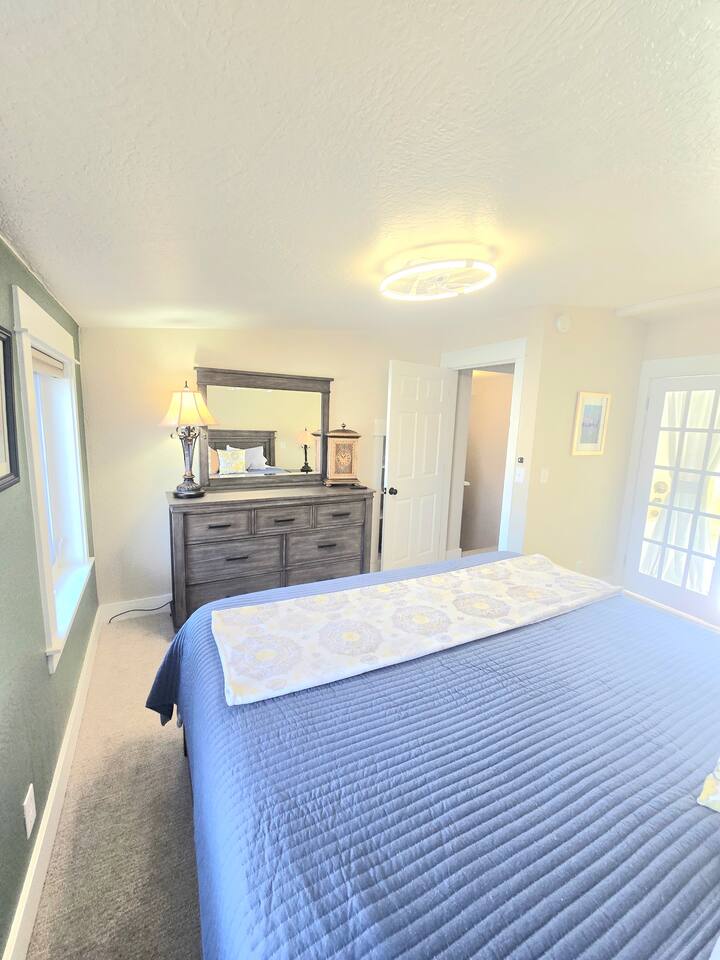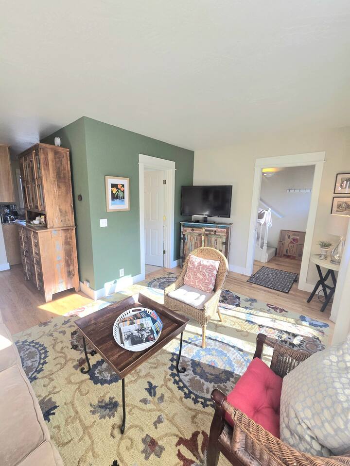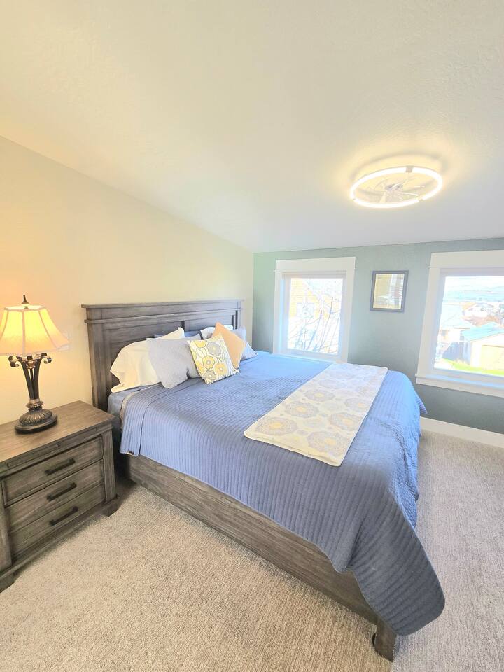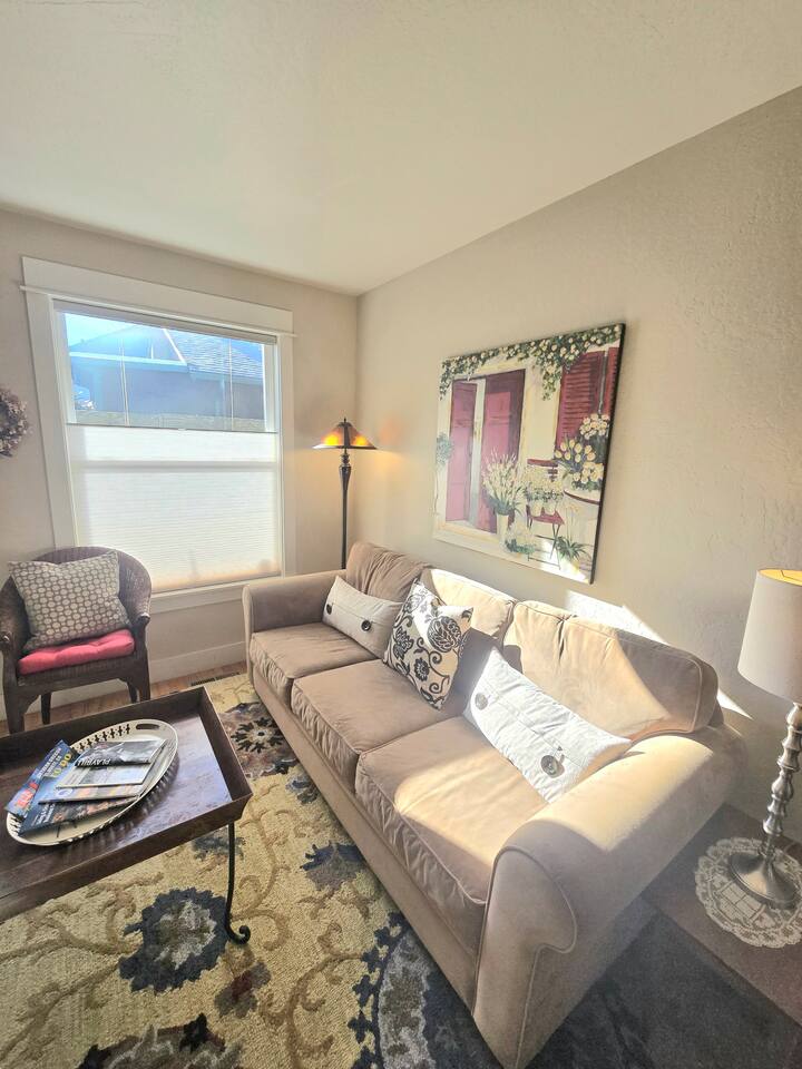 As you step inside, you'll be greeted by warm oak floors that lead you through a thoughtfully designed space. The spacious upper-level primary bedroom features a luxurious queen bed and elegant vaulted ceilings, creating an airy ambiance that is both relaxing and inspiring. French doors open to your private ensuite bathroom, offering a serene escape to unwind after a day of exploring. The second bedroom is equally inviting, perfect for family or a friend, with easy access to the second full bathroom. Gather in the cozy living area, where you can share stories or plan your next adventure, all while basking in the warm glow of natural light that floods the space. Step outside to enjoy the charming neighborhood, where the world-famous Lithia Park awaits just moments from your door. Stroll through its lush landscapes, or indulge in the vibrant local dining scene. Whether you're here for the arts, outdoor activities, or simply to relax, our home provides the ideal base for your Ashland experience. Come and create lasting memories in this welcoming retreat, where every detail is designed with your comfort in mind. We look forward to hosting you!