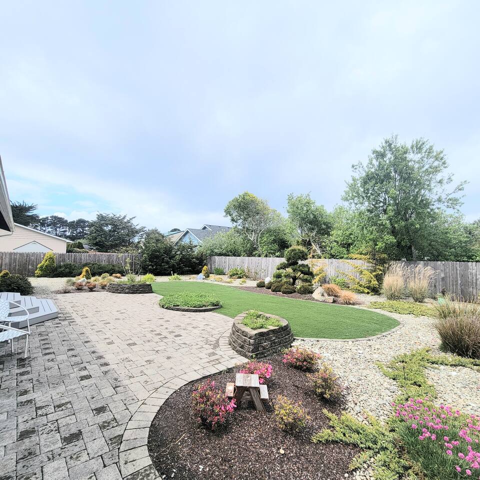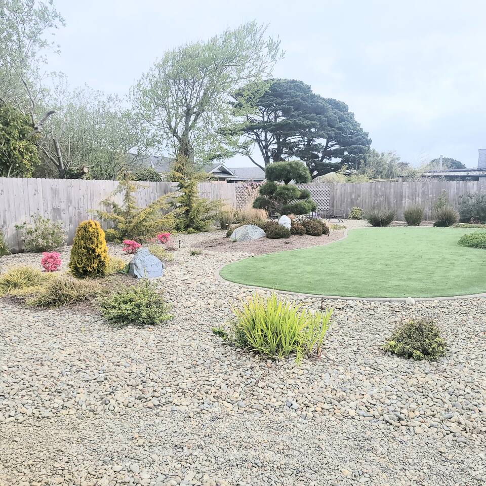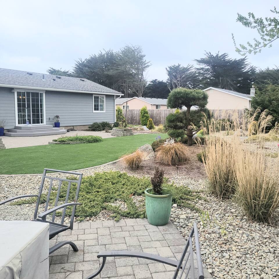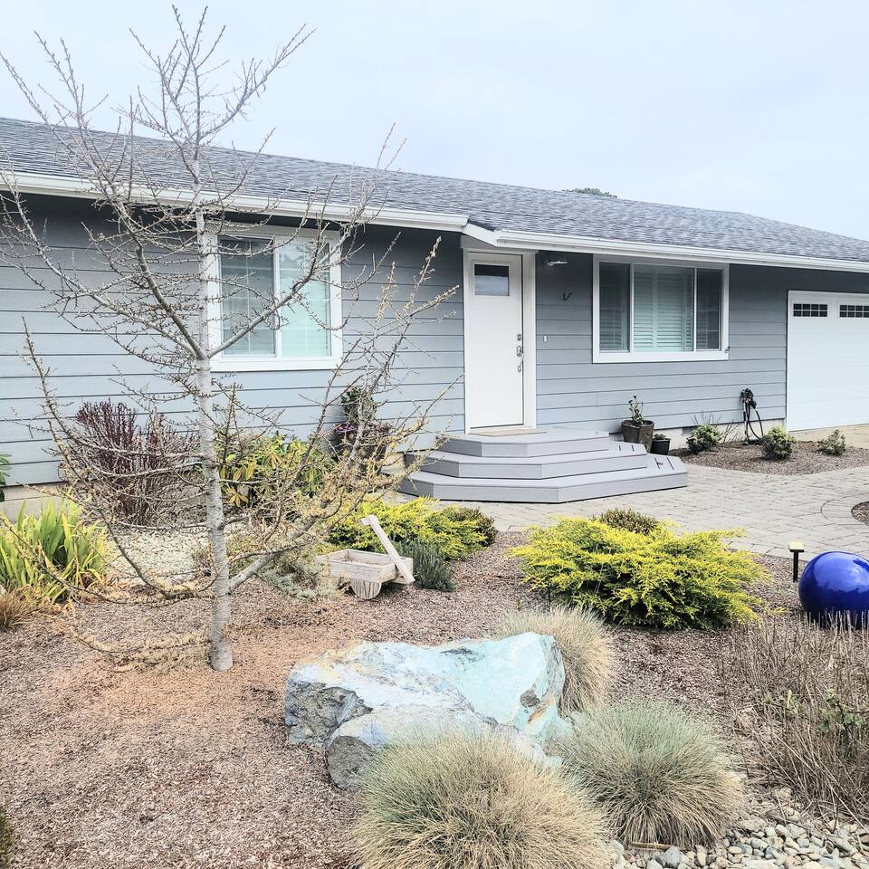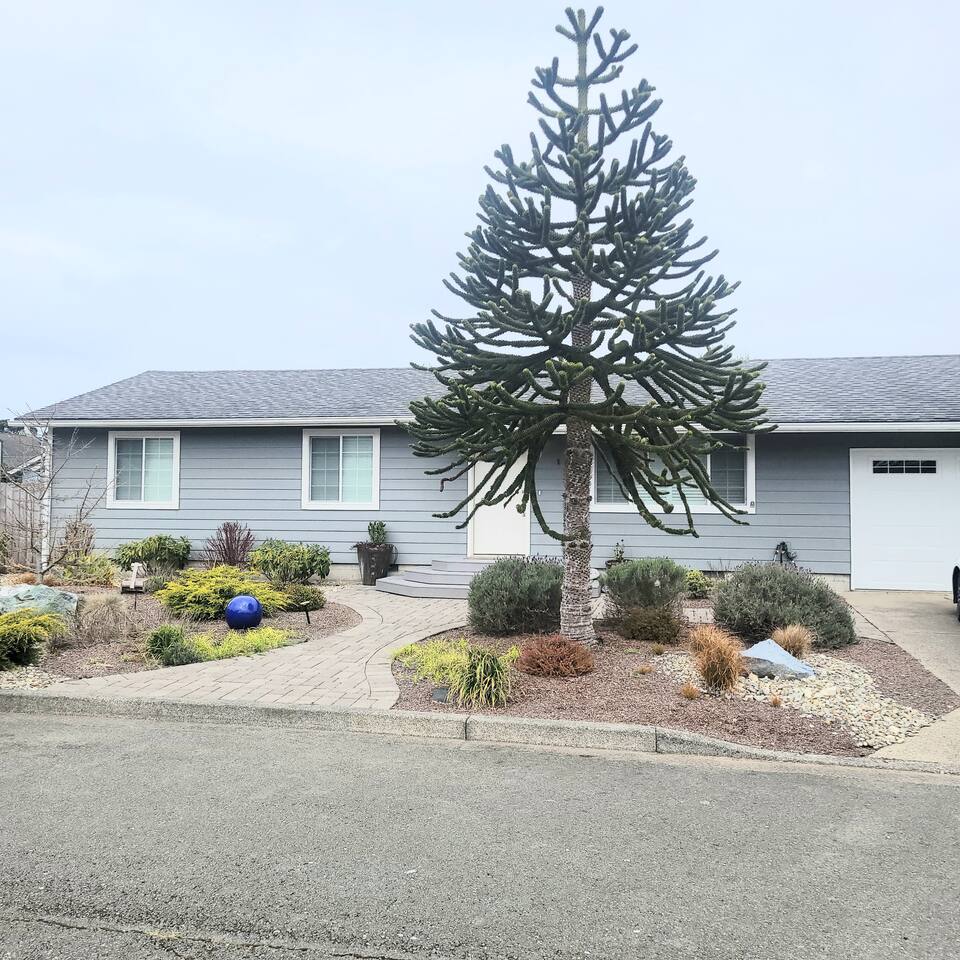 When you enter the house, the living room welcomes you with a nice comfy couch and two cozy chairs, the ambience of a warm inviting fireplace below a large flat screen smart tv. You can cozy up with your favorite book or watch your favorite movie while you unwind from the days adventures. We also offer a library of books in various rooms. The kitchen features new appliances including stainless steel refrigerator, stove/oven, dishwasher, coffee pot, and microwave. and is fully stocked with dishes, pots/pans and cutlery, for a simple dinner for two, or a family feast for six! The dining room features a table and chairs for six, plus two barstools, warm lighting and a great view of the beautifully landscaped backyard. As you wander down the all, you will see the bathroom on the right, with an extra large shower with tub, and beachy decor. Guest bedroom #1 is the master at the end of the hall to the right, just passed the bathroom. This room features a super comfortable queen bed, night stands, and a large dresser and closet. Guest bedroom #2 is at the end of the hall to the left. This room features a comfy queen bed, night stands, bookshelf with books for your reading pleasure, and a closet. Guest bedroom #3 is to the left. This room features a Murphy Bed disguised as a beautiful cabinet, a spacious, dedicated work are with a height adjustable desk, lamp, corkboard and calendar, plenty of closet space (this is where you will find food and water dishes for Fido) The linen closet is at the end of the hall, it holds the extra towels, and extra blankets and sheets. There is a coat closet in the living room as well. Enjoy use of a large garage to park your vehicle in during your stay. This is also where the washer and dryer are located. Currently, we are a dog-friendly rental. We allow up to TWO medium sized dogs with fee. Please clean up after your dog(s). With a huge fully fenced backyard, our house is an ideal place for guests who travel with their pets. Bandon is a very pet-friendly town! Location is everything to some. We are located at the very end of a super quiet street, there is no traffic noise at all, you have all the privacy you could want, while still being close to everything Bandon has to offer. Bandon offers a variety of fishing opportunities; whether you are interested in Coho or Chinook Salmon, Halibut, rock fish, catching your own Dungeness or Red Rock crab or even clamming in the mud flats. If you enjoy golfing, our home is located just a few minutes from the world famous Bandon Dunes Golf Resort & Bandon Crossings Golf Course. Bandon also offers a variety of highly rated restaurants, coffee shops, boutiques & specialty shops, and of course, several beaches!